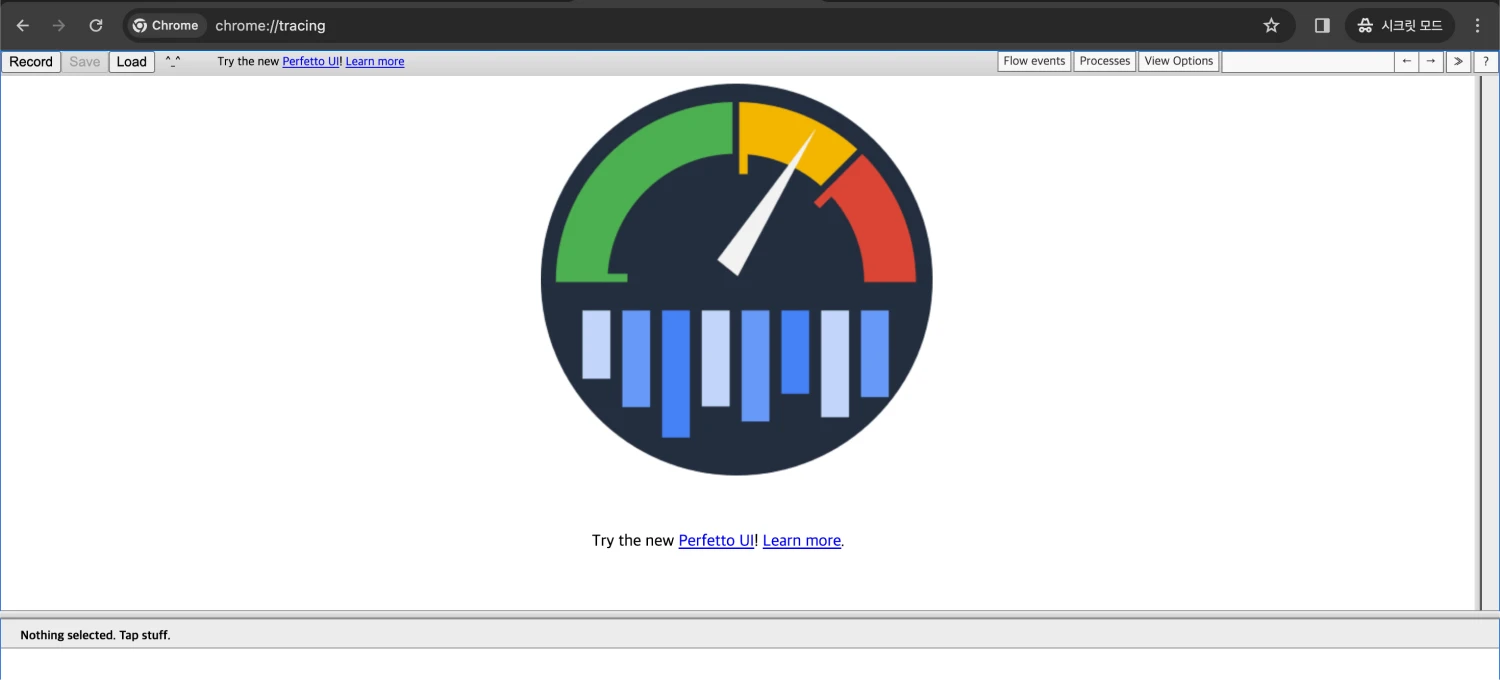 크롬 개발자 도구의 성능 탭은 일반적인 웹 개발에 충분한 정보를 제공해 주고 있다고 생각한다. 하지만 크롬 브라우저는 성능 탭보다 더 자세히 볼 수 있는 트레이싱 도구를 제공하는데 주소창에 chrome://tracing으로 접속하면 볼 수 있다.
