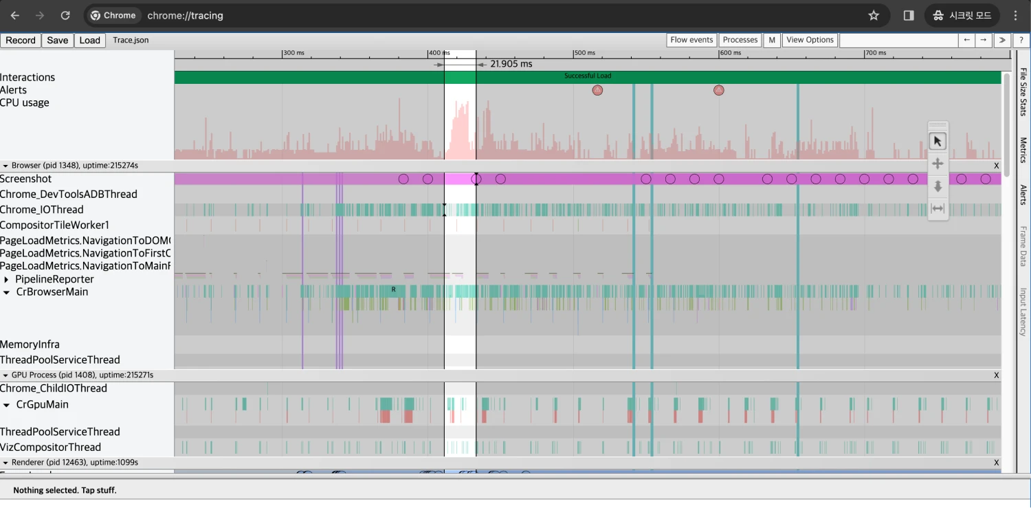 크롬 개발자 도구의 성능 탭에서는 성능 프로파일을 JSON 파일로 다운로드할 수 있는데 이를 트레이싱 도구에 업로드해 보았다.