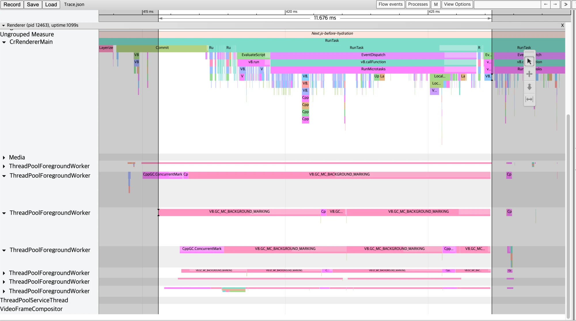 확대한 구간에서 렌더러 프로세스의 메인 스레드와 워커 스레드를 볼 수 있는데 7개의 워커 스레드에서 V8.GC_MC_BACKGROUND_MARKING와 CppGC.ConcurrentMark라고 하는 작업이 활발하게 진행 중이었다.
