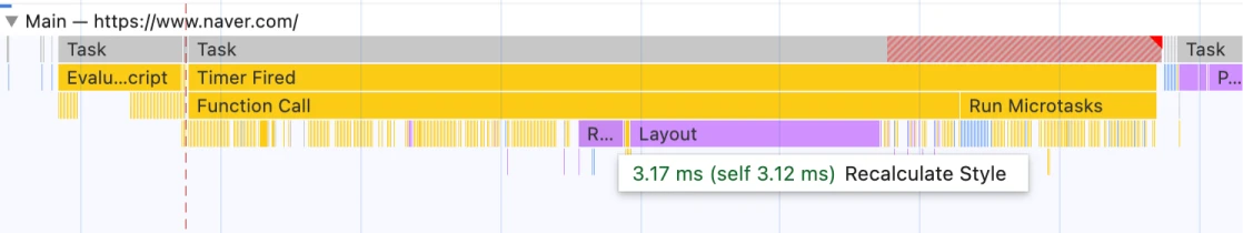 네이버 메인 페이지의 첫 프로파일링 이미지를 다시 보면 Task중에 빨간색 삼각형 마크가 붙어있는 영역을 볼 수 있다. 이는 Long Task라고 불리며 50ms 이상 소요되는 태스크에 붙혀지는 상당히 불명예스러운(?) 마크이다.