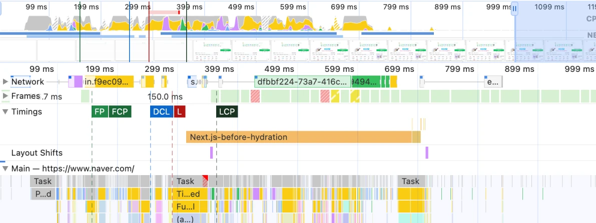 네이버 메인 페이지의 0ms ~ 1000ms 성능 프로파일