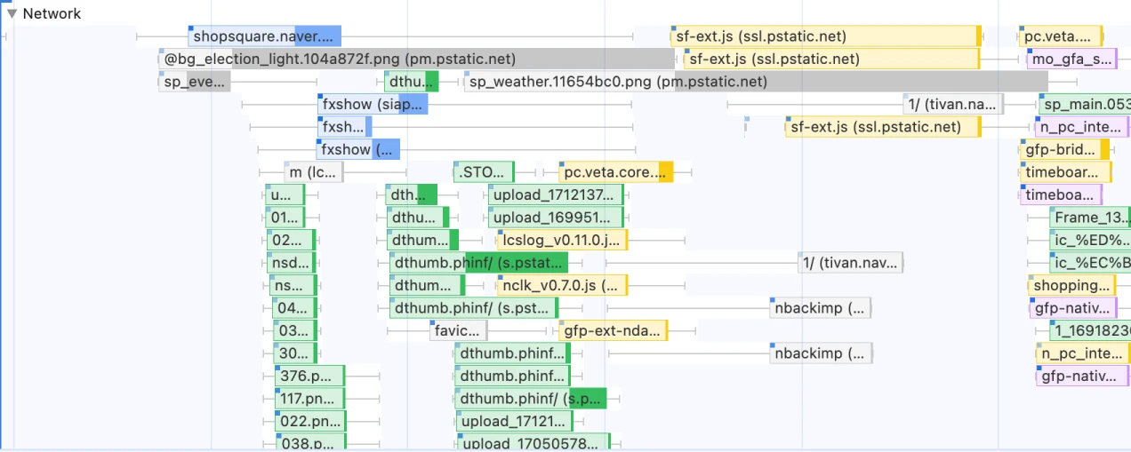 크롬 브라우저에서 HTTP/1과 HTTP/1.1은 도메인 샤딩을 이용하여 최대 6개까지 요청이 가능하다. 그렇지만 네이버 메인 페이지에서는 보다시피 대부분이 사실상 요청 개수 제한이 없는 HTTP/2 이상에서 이루어지는 걸 볼 수 있다.