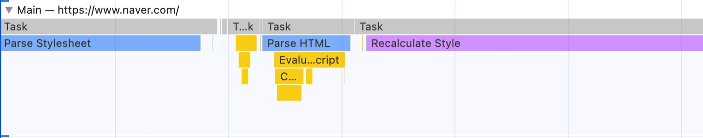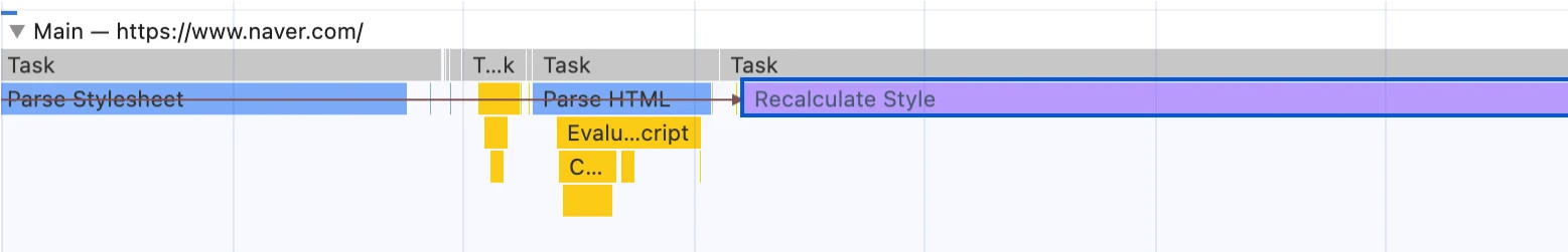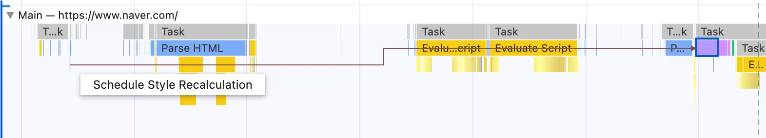 그렇다. 우리가 보았던 Recalculate Style은 사실 옛날 옛적에 있었던 Parse HTML 과정 중에 태스크 큐에 스케줄 된 작업이었다. 참고로 브라우저의 태스크 큐는 일반적인 선입선출(FIFO)이 아니며 휴리스틱 기반의 스케쥴링으로 태스크의 순서가 바뀐다.