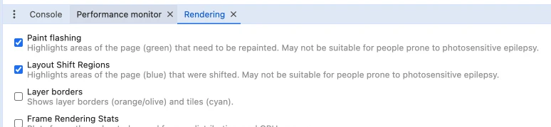 이러다 보니 애니메이션 작업이 많을 때는 개발자 도구의 렌더링 옵션에서 Paint flashing과 Layout Shift Regions 옵션도 켜두고 작업해왔던 거 같다.