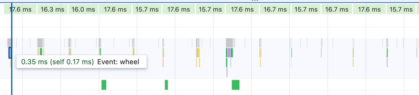 메인 스레드에서 초록색 작업은 화면에 그리는 작업을 의미한다고 생각하면 되는데 운영체제에서 받는 VSync 신호에 맞춰서 하나의 프레임마다 약 16.7ms 내외로 스크롤 중인 화면의 렌더링을 끝마치는 걸 알 수 있다. 프레임 드롭 없는 이상적인 기록으로 볼 수 있다. (짝짝)