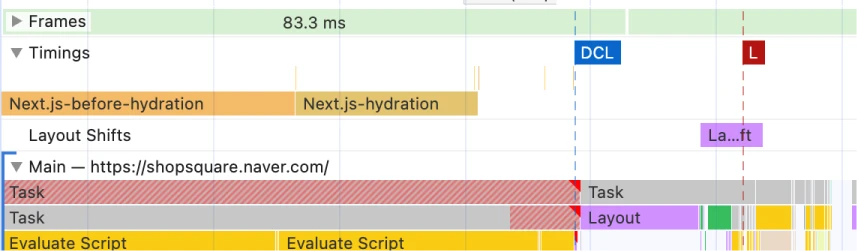 쇼핑 영역의 프로파일을 보면 hydration이 끝난 뒤 DCL이 찍혀있는 걸 확인할 수 있다.