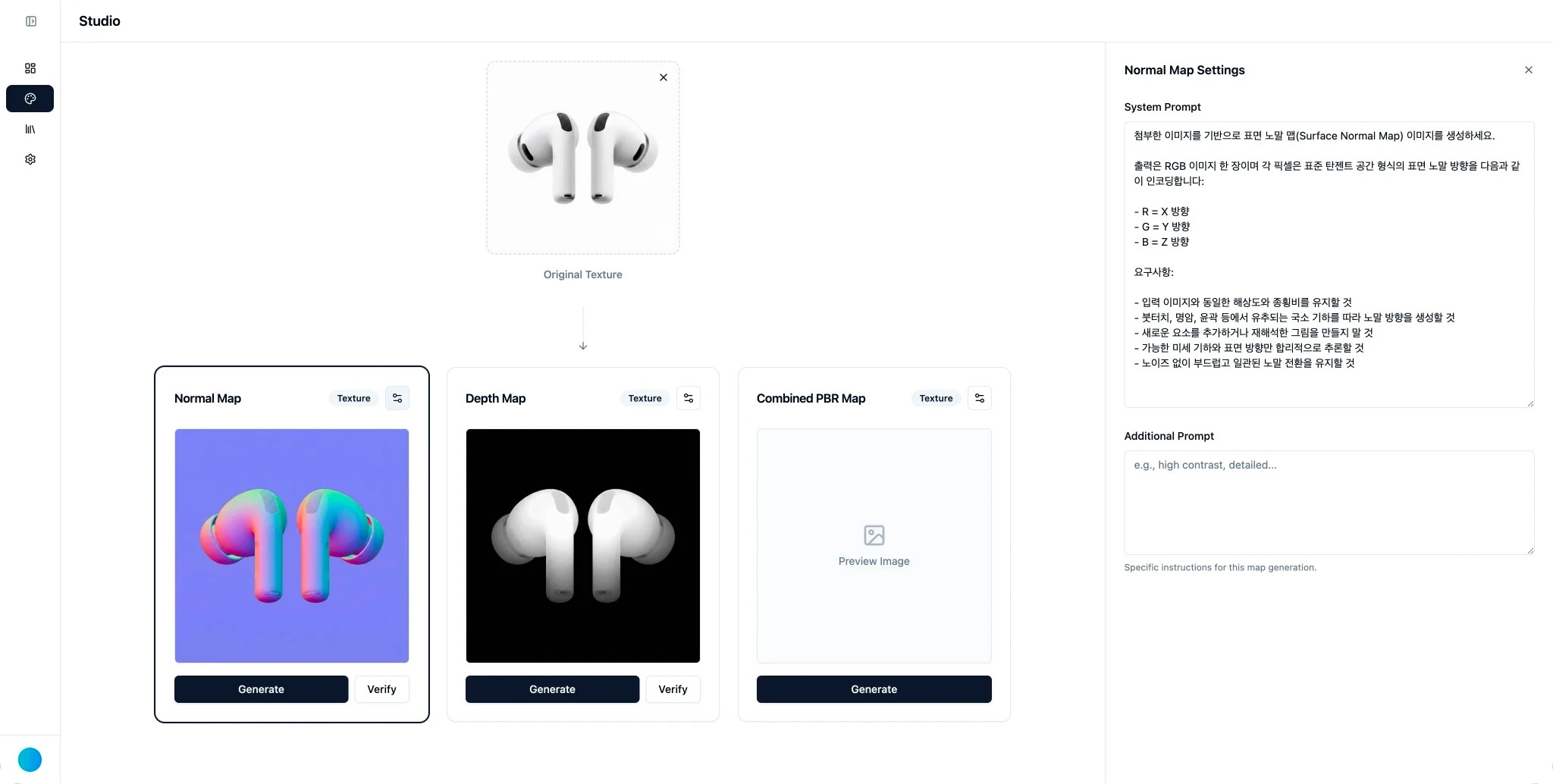 우선, 사용자가 상품 이미지를 업로드하면, 사전 정의된 시스템 프롬프트를 이용하여 나노바나나 프로 API로 노멀 맵과 깊이 맵 텍스처를 생성할 수 있도록 구현했다. 생성된 텍스처 이미지는 별도 저장소에 보관된다.