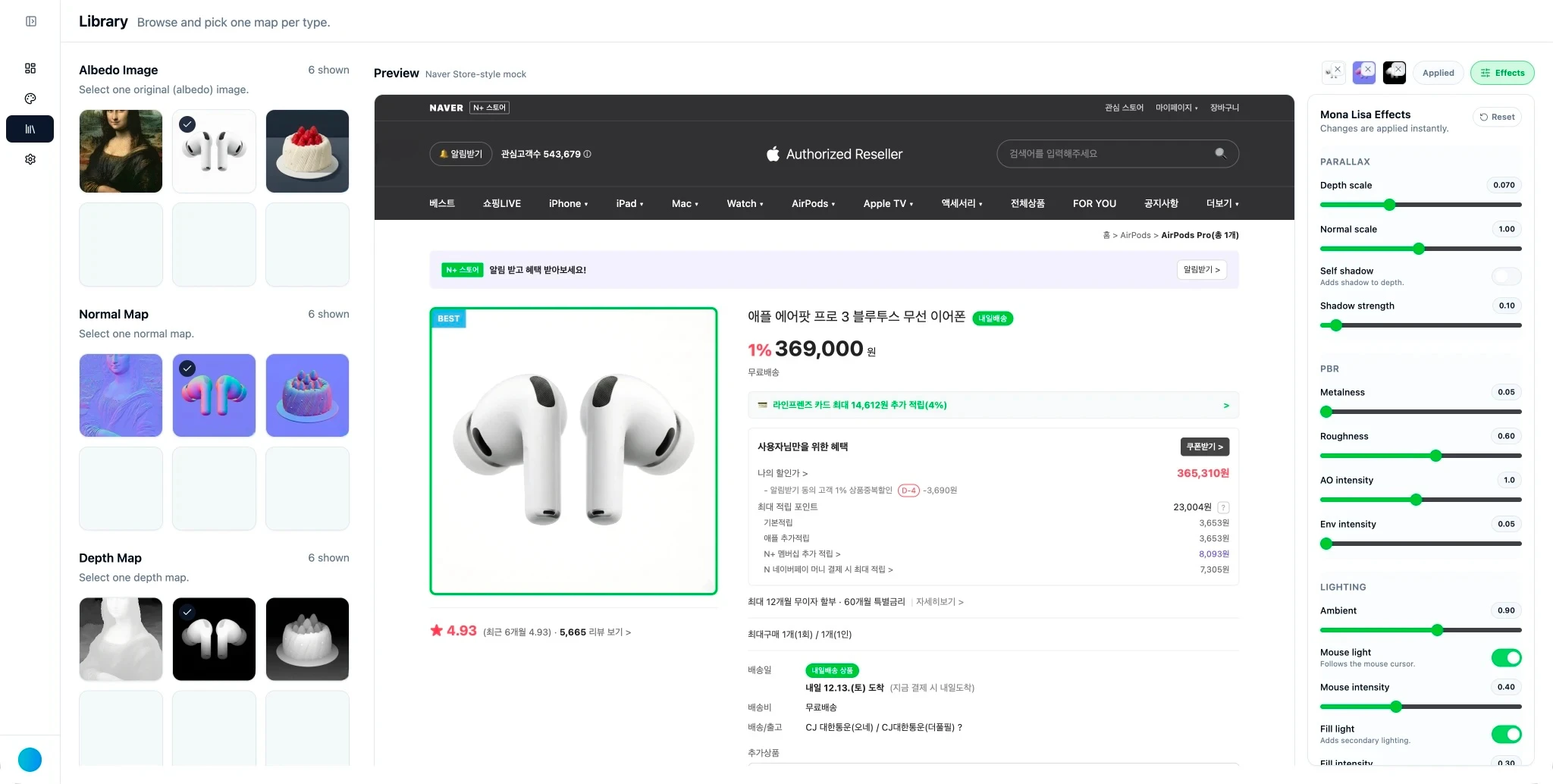 물론 완벽하지는 않다. 특히, 복잡한 형태의 제품은 깊이 맵 텍스처 생성이 어려워서 입체감이 떨어지는 경우가 있다. 실험에 사용된 에어팟 프로 이미지의 경우 비교적 단순하고 매끄러우며, 빛이 반사되어도 크게 어색하지 않은 형태라서 좋은 결과를 얻을 수 있었다.