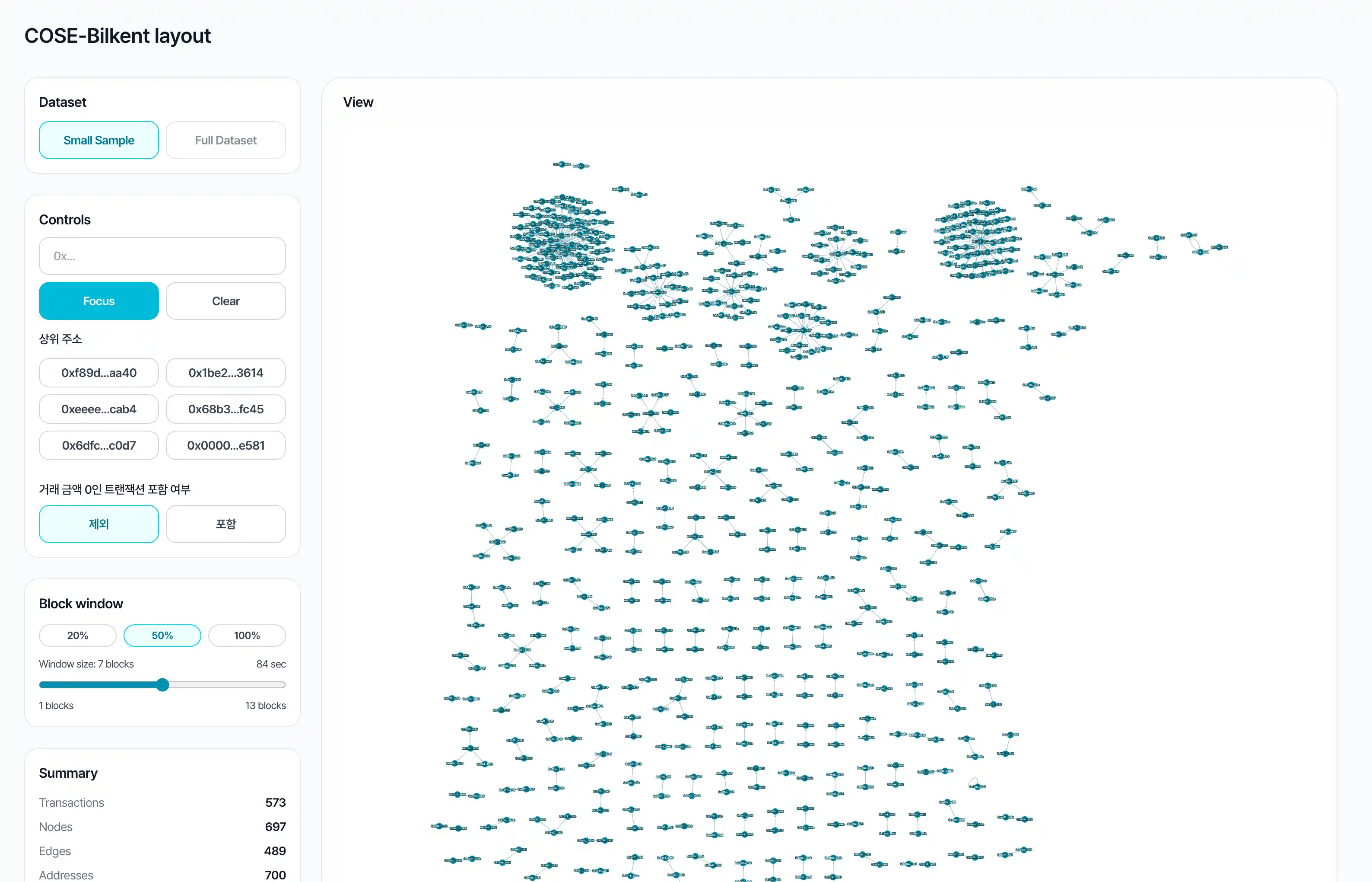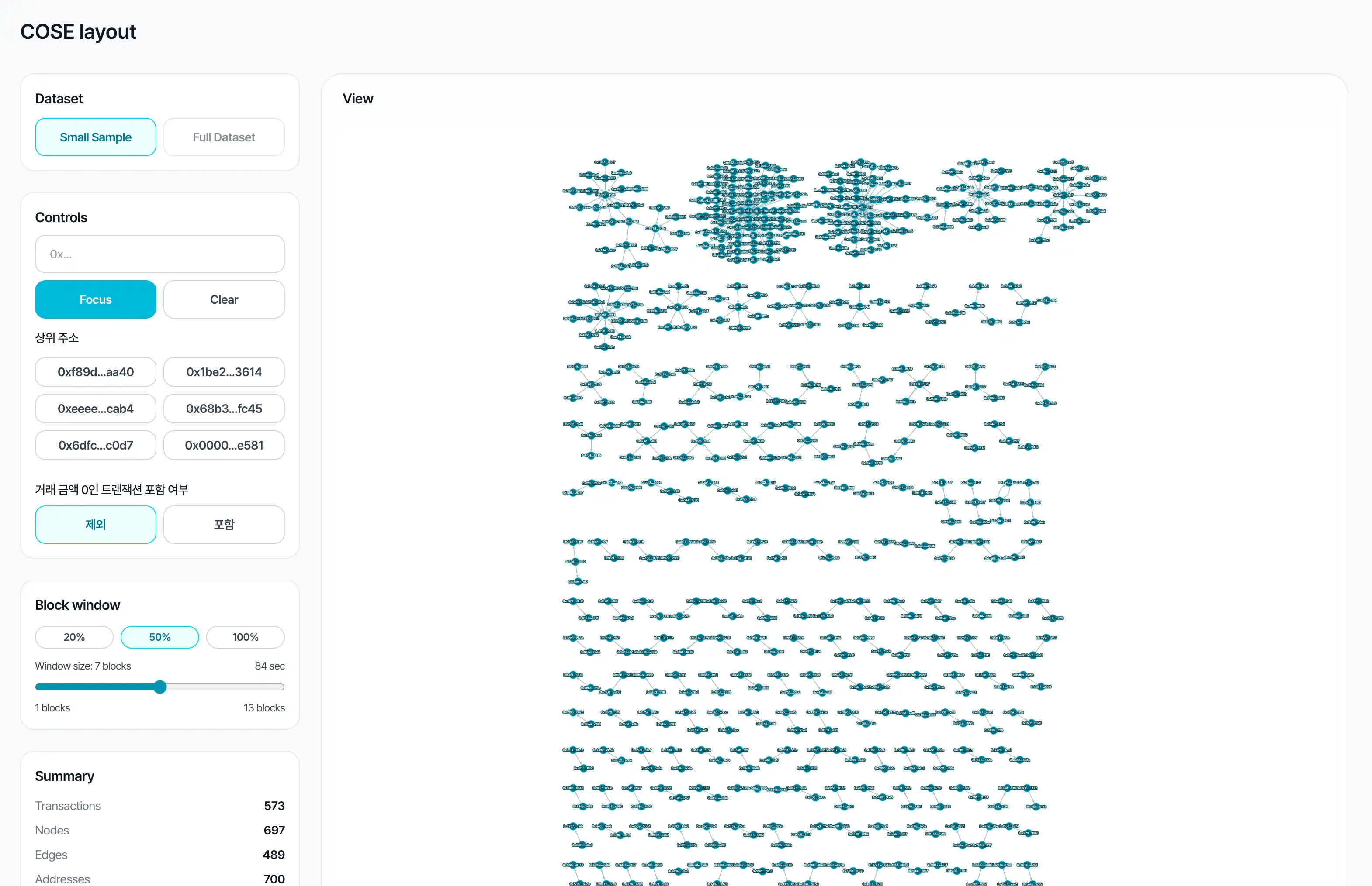 약 0.39초로 이 예제 기준으로는 CoSE와 큰 격차의 시간 차이지만, CoSE-Bilkent와는 차이가 크지 않고 오히려 소폭 늘었다. 원인은 이더리움 송금 데이터가 상대적으로 단순한 구조이기 때문으로 추측되는데, 더 복잡한 관계를 가진 데이터 셋에서는 fCoSE의 스펙트럴 초기화가 더 큰 성능 향상을 보일 수도 있겠다.