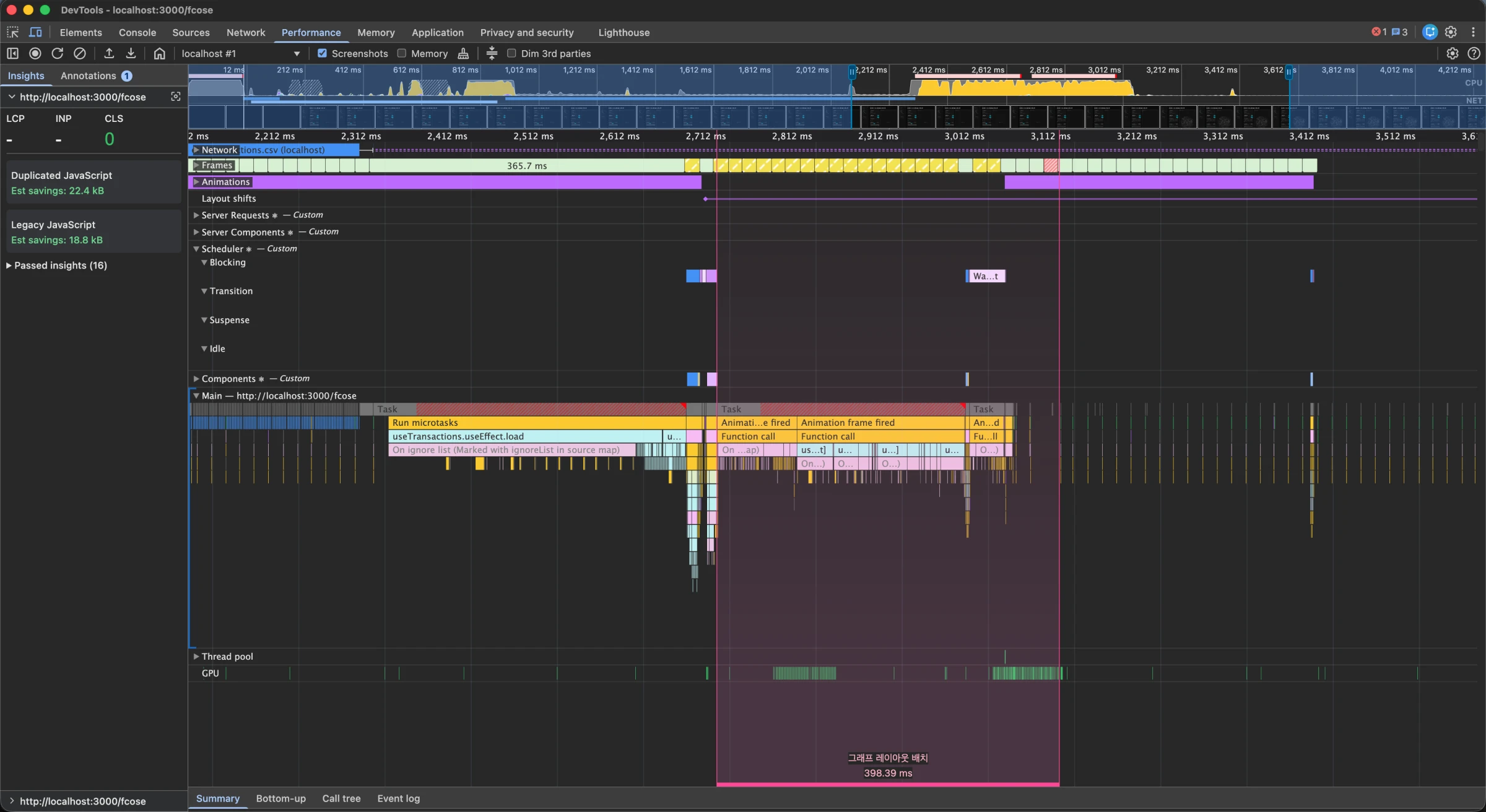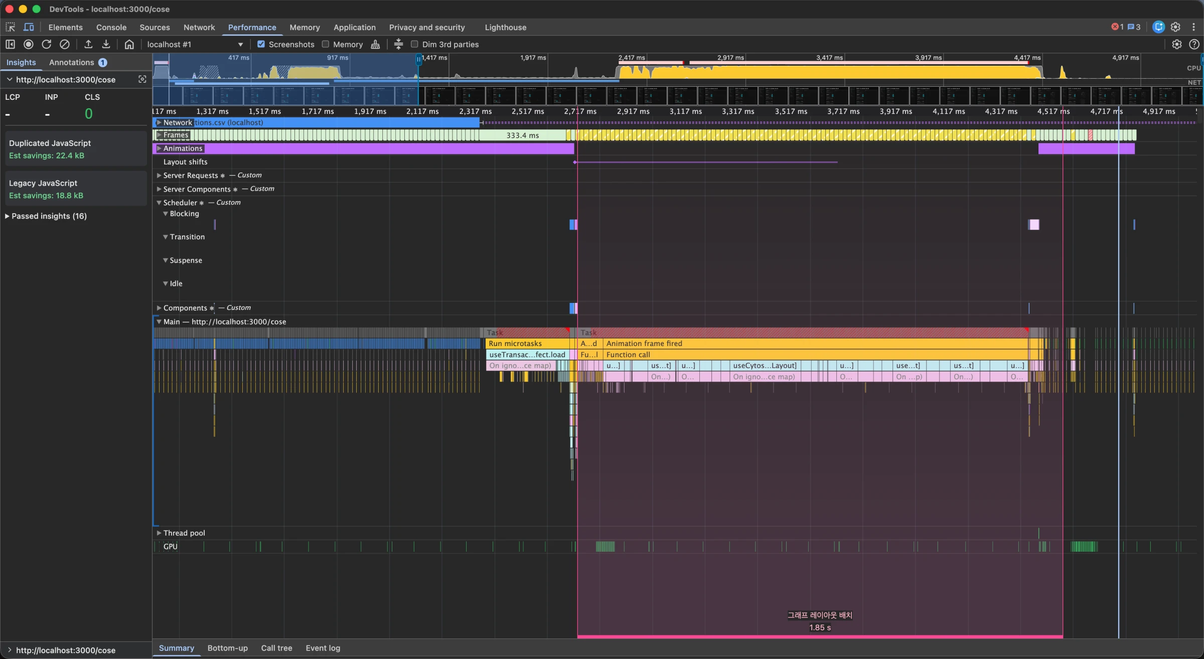 개선된 CoSE도 여전히 근본적인 문제를 안고 있다. Force-directed의 기본 원리를 따르기 때문에 모든 노드 쌍 사이의 반발력을 계산해야 한다. 시간 복잡도는 O(n^2)로 노드 수가 증가하면 연산량이 기하급수적으로 증가한다. 실제로 개발자 도구로 측정하면 심각한 메인 스레드 병목을 확인할 수 있다.