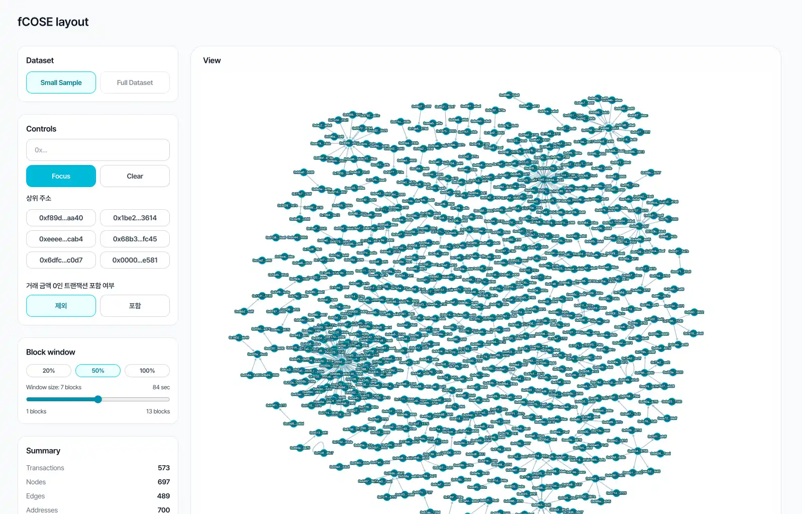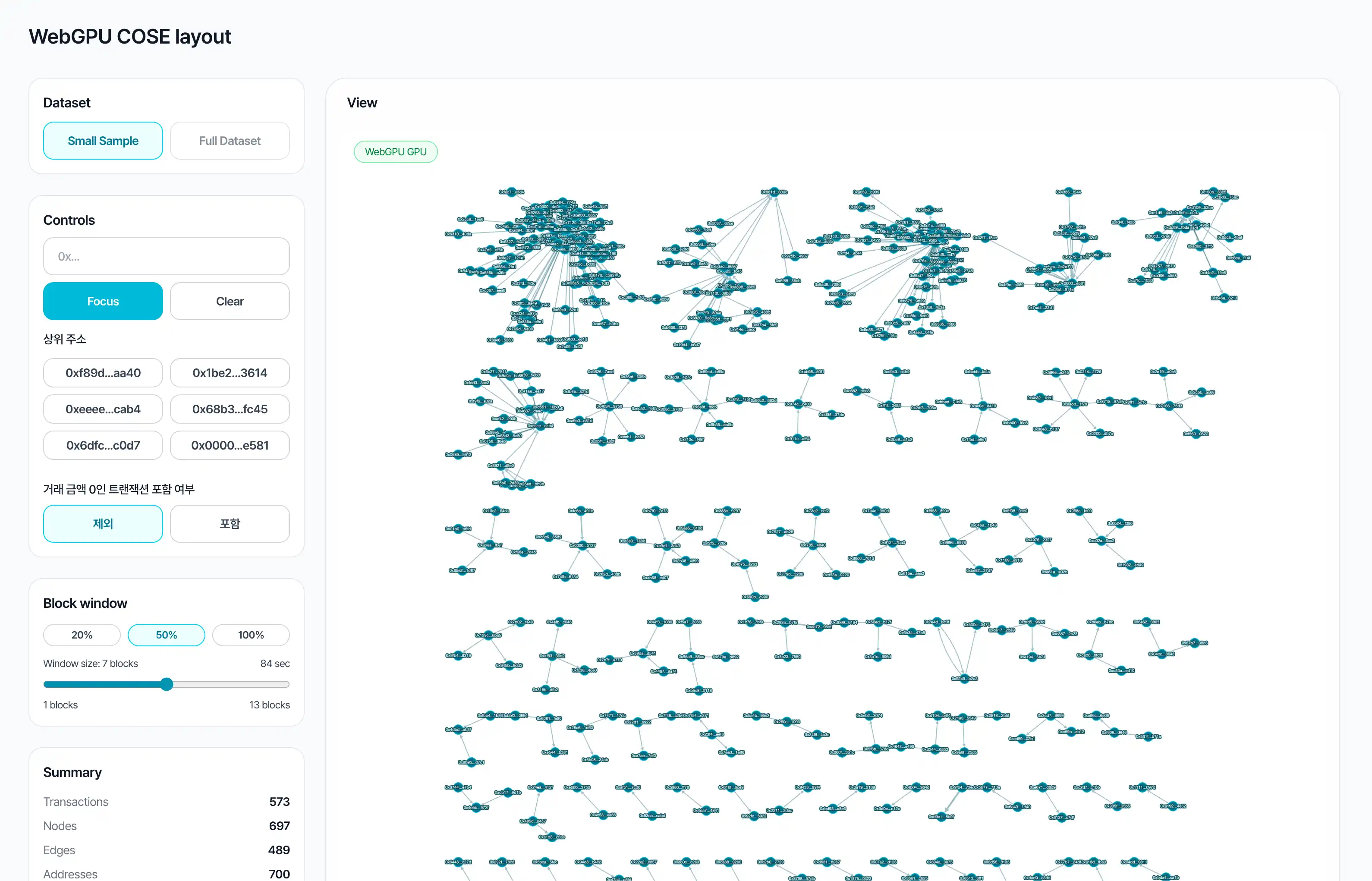 익숙한 데이터로 실험하기 위해 이더리움의 특정 블록 송금 데이터를 선택했다. 이 글에서는 이더리움 송금 데이터를 바탕으로 Cytoscape.js와 WebGPU를 활용해서 시각화하는 과정을 기록해본다.