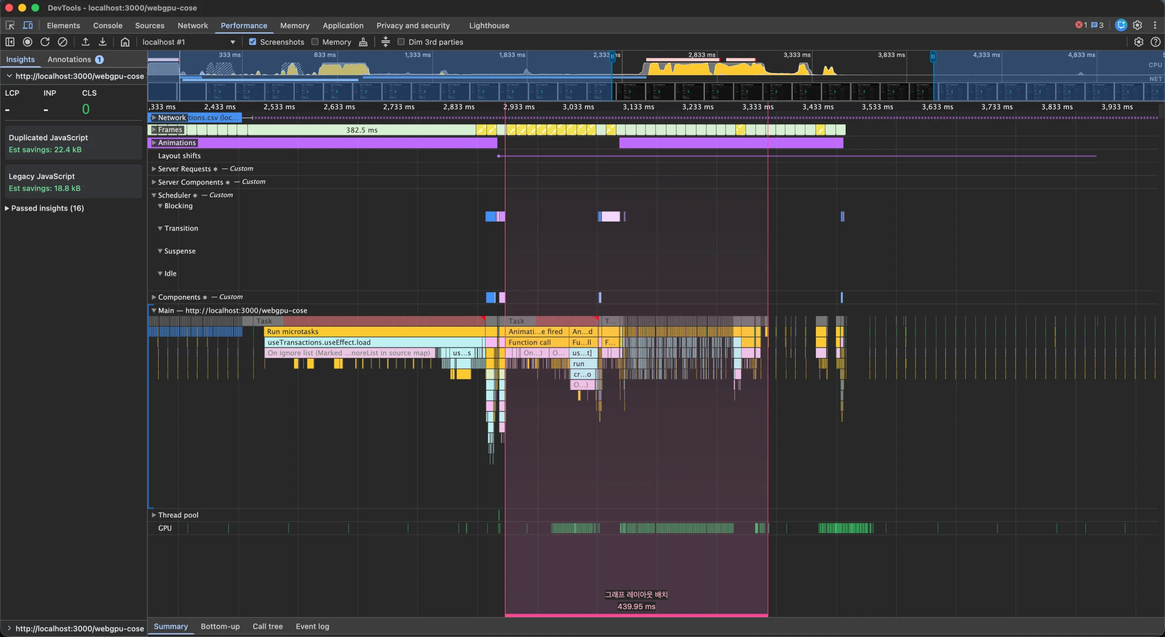 또한, 플레임 그래프를 보면 앞서 다른 알고리즘과 다르게 GPU 연산이 늘고, 메인 스레드의 작업이 잘게 쪼개져서 idle 시간이 많이 생긴 것을 확인할 수 있다.